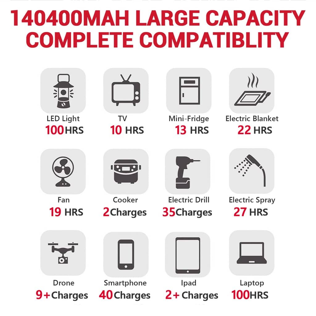 La batería de litio incorporada de 520 WH/140 400 mAh alimenta todos sus dispositivos pequeños a medianos con más de 1000 ciclos, perfecto para viajes de campamento más largos, fiestas en el patio trasero o energía para llevar en caso de un corte de energía de emergencia (solo los puertos de CC admiten carga de paso).