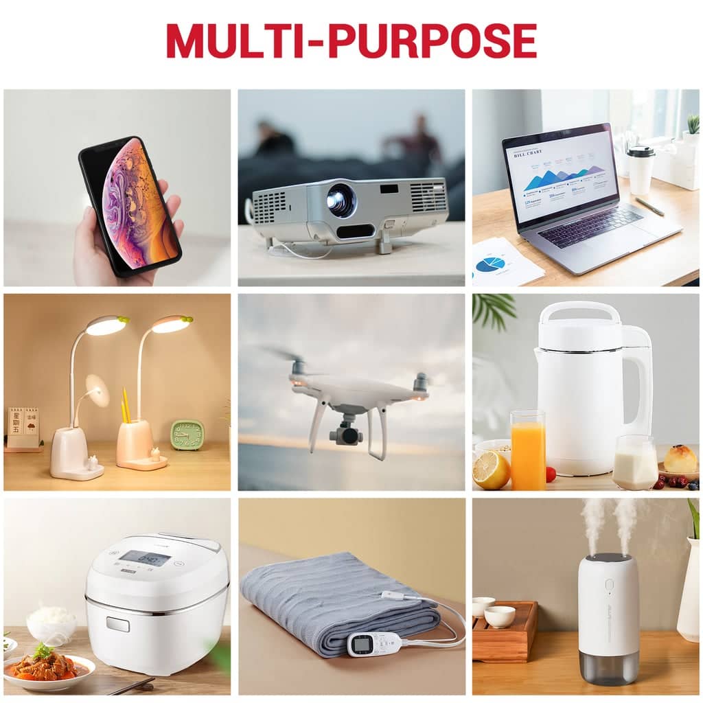 - [ESTACIÓN DE ENERGÍA PORTÁTIL TODO EN UNO] Incluye cuatro puertos USB (5~9 V/2 A QC3.0 + 5~9 V/2 A Tipo-C + 5 V/3.1 A 2 USB), toma de CA (CA 110 V ± 10 %, 500 W, pico de 1000 W) y 4 puertos de salida de CC de 5,5 mm x 2,1 mm (9~12,6 V/10 A, 12 A máximo en total); puerto para coche (12 V/10 A máximo). Alimentación de teléfono, almohadilla, tabletas, GPS, ordenador portátil, GoPro, cámara, drones, bombillas de festivales y máquina CPAP de menos de 500 W para el puerto de CA (*use el convertidor de CC Rockpals S10/S9 que se vende por separado para que dure al menos 4 noches para su máquina CPAP ReSmed).